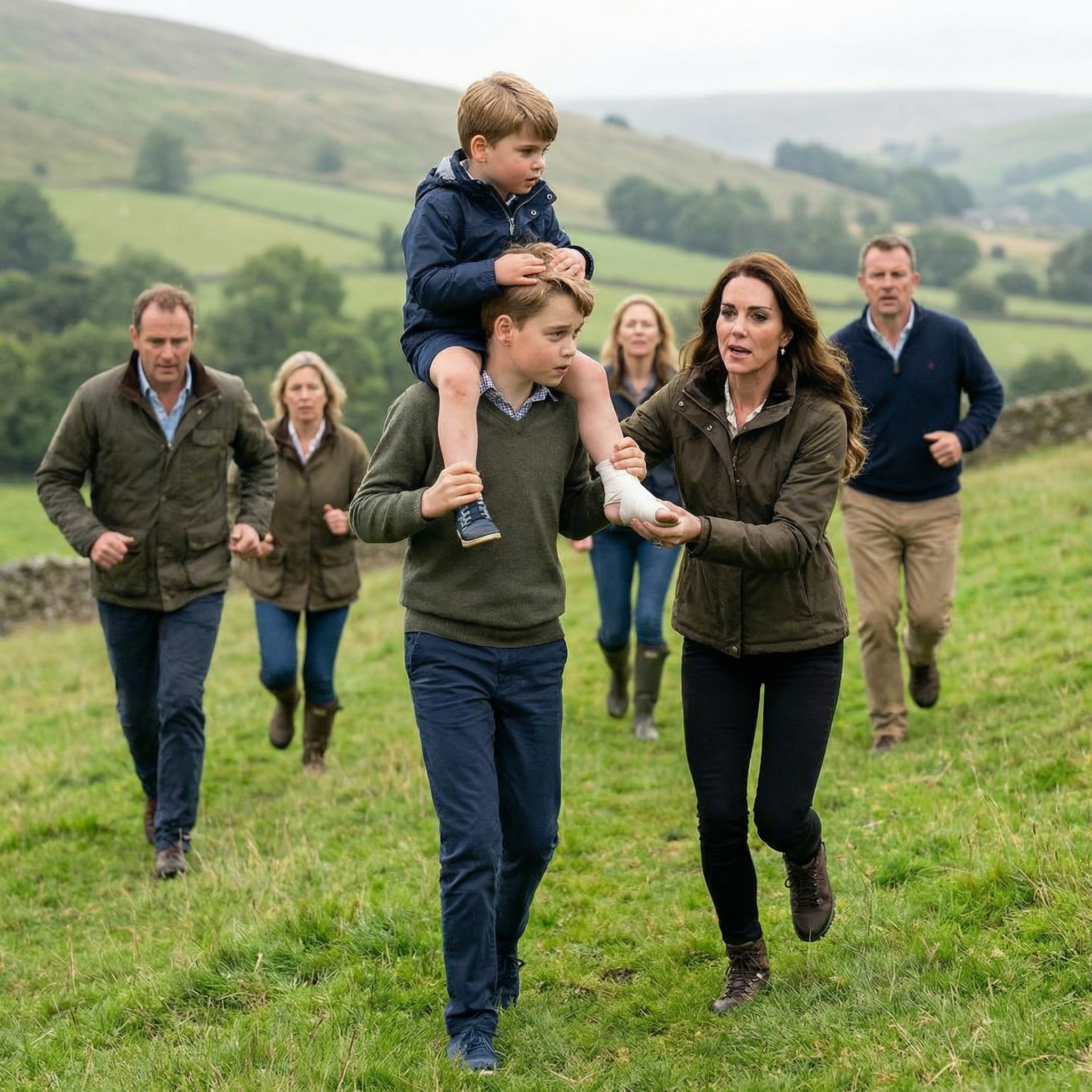 The family was enjoying a beautiful tour of historic landmarks, soaking in the heritage of the Scottish Highlands. The day was filled with energy until Prince Louis—well-known for his playful and adventurous spirit—stumbled and hurt his leg. While the injury was minor, it was enough to cause the young prince some distress, leaving him with a bandaged foot and a need for a little extra help. 🏞️