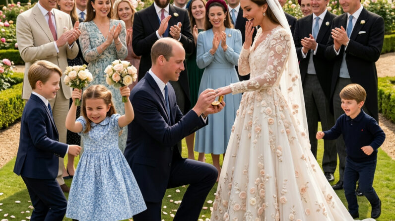 A beautiful and unforgettable scene unfolded in the gardens as Prince William knelt gracefully before his bride, Catherine Princess of Wales, creating a moment filled with love, laughter, and family warmth. Surrounded by friends, relatives, and their delighted children, the atmosphere felt less like a formal royal event and more like a joyful family celebration.