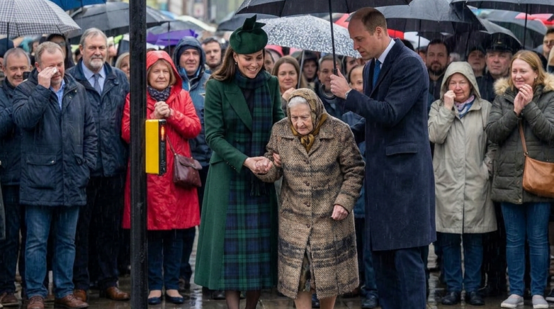 Without hesitation, Catherine gently took the woman’s hand, offering reassurance and warmth. At the same time, William stepped closer, holding his umbrella over her to shield her from the rain. Their coordinated, instinctive response created a moment of genuine care that stood out even in the crowded street.