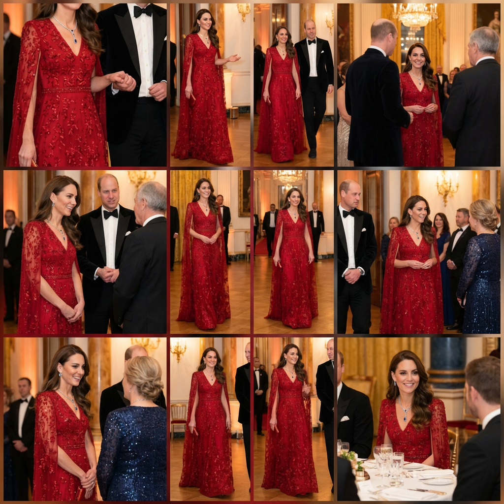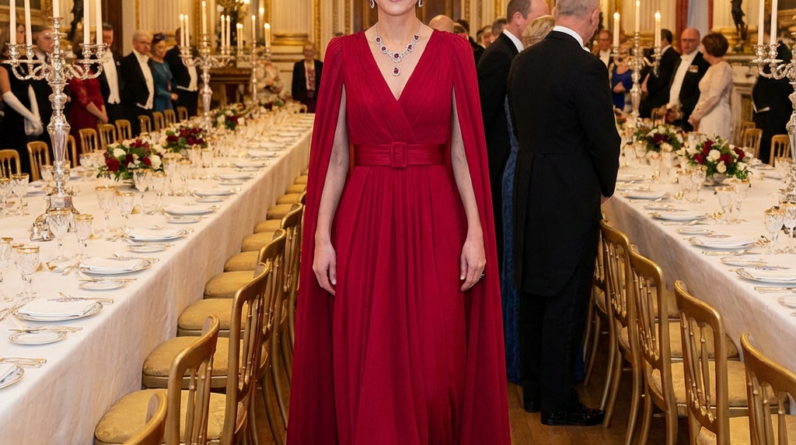 At the French State Banquet honoring President Emmanuel Macron, Catherine stunned in a deep crimson silk crepe cape gown by Sarah Burton for Givenchy. The structured shoulders flowed into soft pleats, creating fluid movement with every step. The ceremonial red hue symbolized unity and diplomacy. She accessorized with Queen Maryâs Loverâs Knot tiara, diamond earrings, and a lily-of-the-valley clutch embroidered in silver threadâadding tenderness to the grandeur. Her presence exuded quiet authority as the monarch-in-waiting.